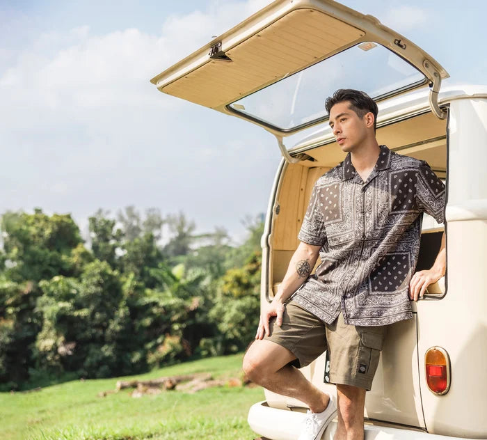 Date nights, vacations, concerts, workdays…any scenario is a ft for our Harley Bandana Shirt. Built from lightweight, breathable cotton poplin that’s washed for softness and a well-worn feel from your first wear. This short sleeve men’s shirt is a mechanic build that’s slightly shorter and roomier. Its custom allover print reimagines the classic paisley pattern by peppering in our namesake (zoom in for a better look).
