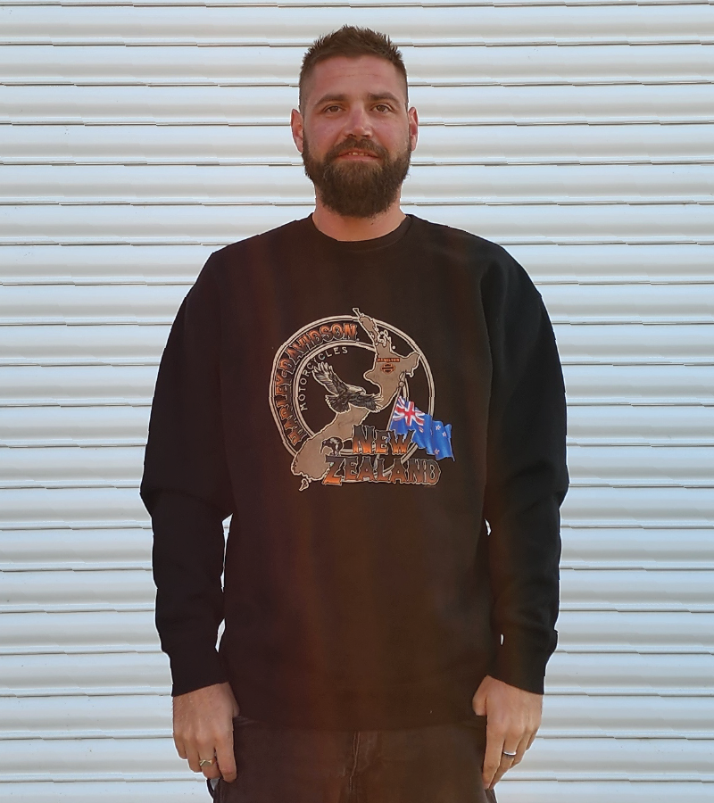 This fleece crew neck features a custom New Zealand map graphic on the front with a Road and Sport™ Harley-Davidson® print on the back.